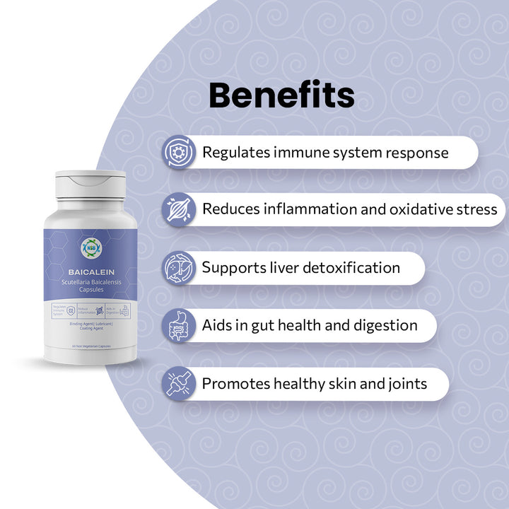 A premium flavonoid supplement derived from Scutellaria baicalensis, known for its potent anti-inflammatory, antioxidant, and neuroprotective benefits. It supports immune function, cardiovascular health, and cellular resilience.