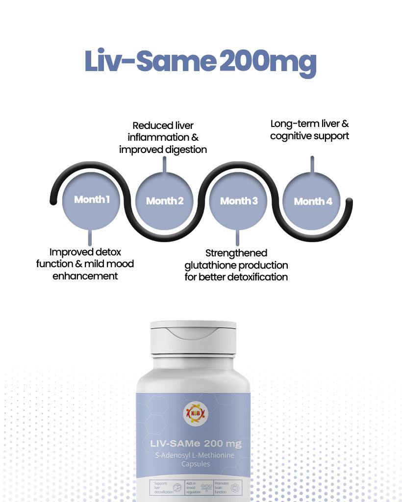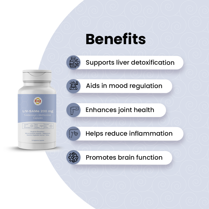 A SAMe (S-adenosylmethionine) supplement that supports liver detoxification, mood balance, and joint health. It enhances methylation and promotes overall metabolic wellness.
